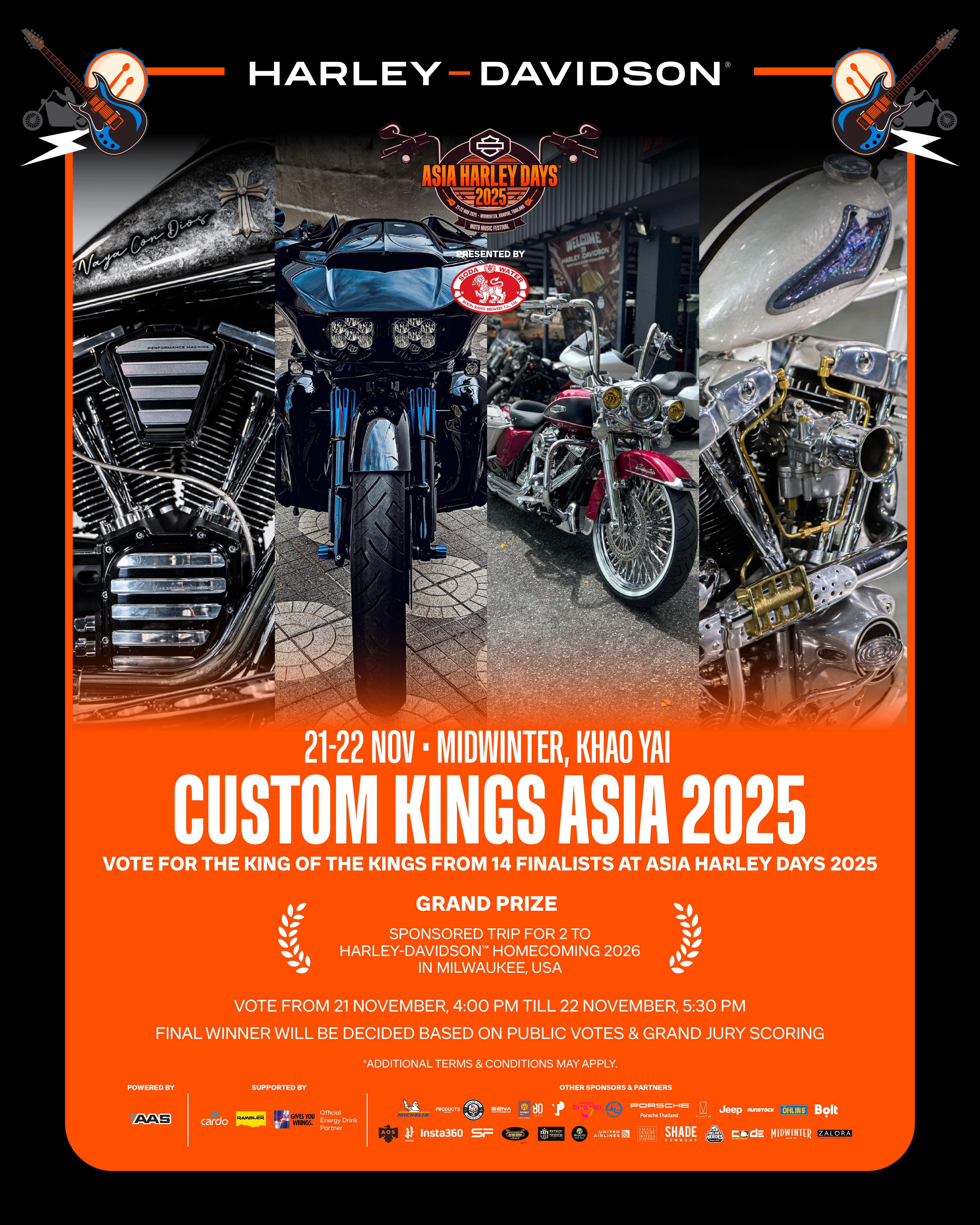 1.) H-D™Owners, 2.) Custom Builders, 3.) H-D™ Dealers. The best 3 from each category will be selected for the finale – KING OF THE KINGS at the Asia Harley Days™ 2025 (21-22 Nov, Midwinter, Khao Yai, Thailand). The grand winner will get the prized trophy from H-D® leadership, and also the sponsored trip to the annual H-D™ festival in Milwaukee, Homecoming 2026.